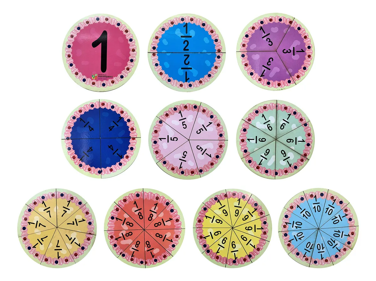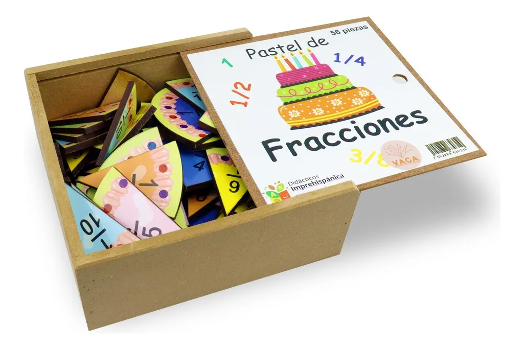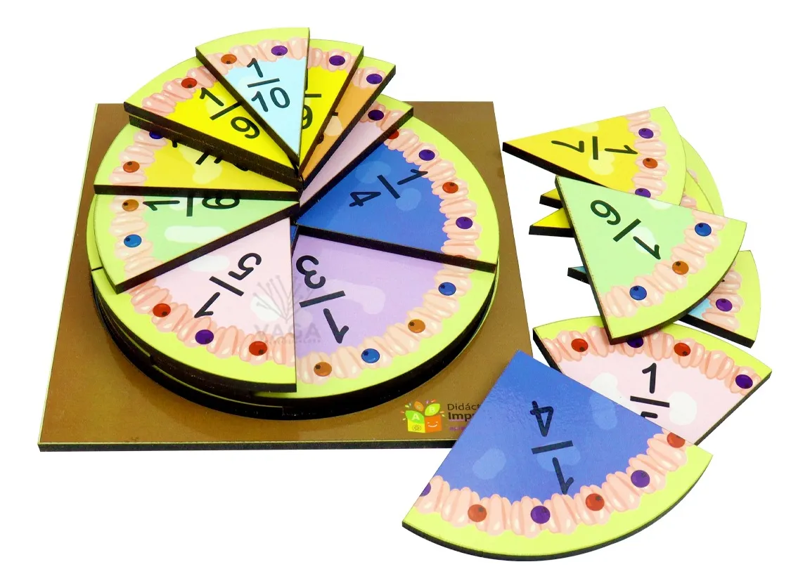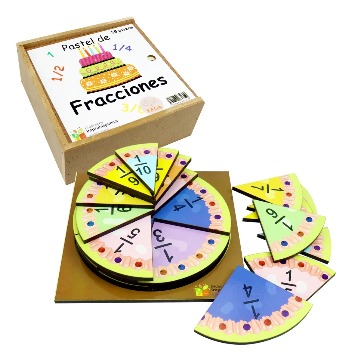 El pastel de Fracciones se desarrolla en el pensamiento matemático desde muchas perspectivas, ya que este facilita múltiples aplicaciones a nivel matemático. Contiene 56 piezas. Objetivos a Conseguir: *Identificar la unidad (circulo compacto). *Realizar construcciones de fracciones de las partes al todo. *Realizar sumas y restas de fracciones . *Halla Fracciones equivalentes.