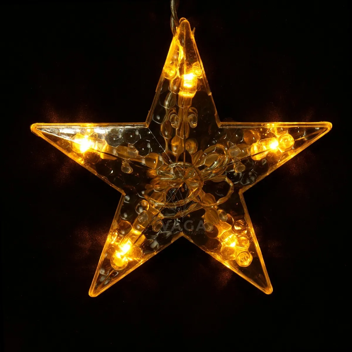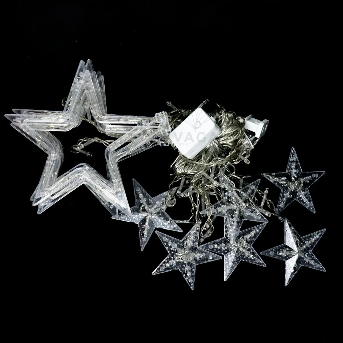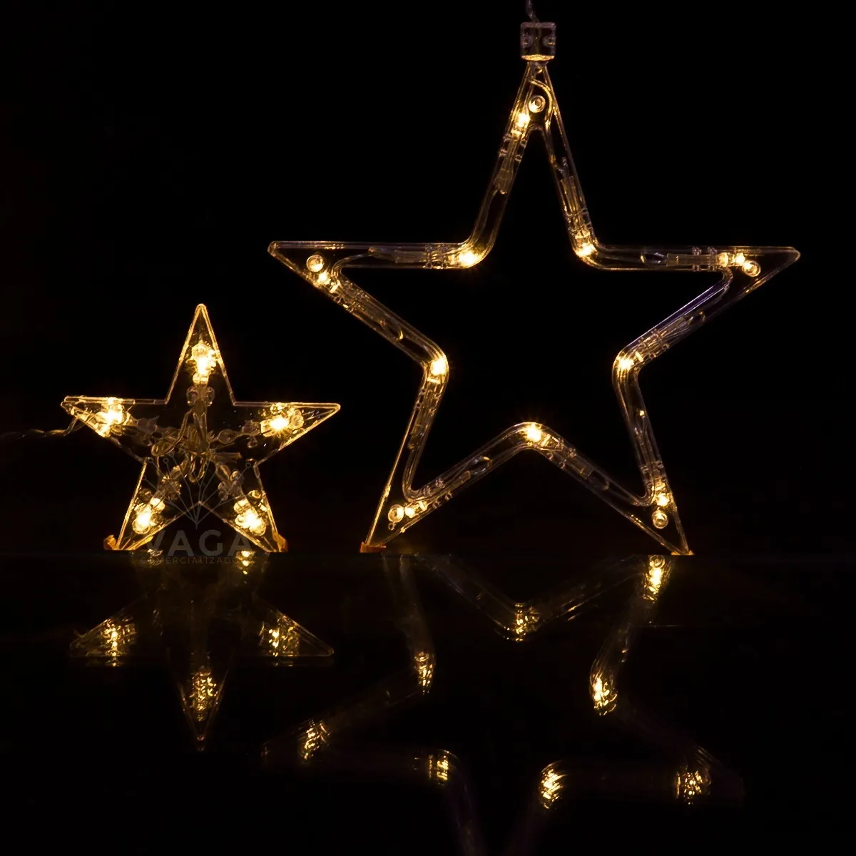 Hermosa serie estilo lluvia de estrellas perfecta para dar un toque mágico hogar o evento (Boda, XV años, Bautizo) o simplemente como una linda decoración para esta navidad. Descripción: Serie con 12 tiras suspendidas y múltiples foquitos de led las cuales hacen un increíble efecto de lluvia de estrellas Longitud: 3 metros Largo: 6 tiras de led de 80 cm y 6 tiras de led de 50 cm 12 estrellas: 6 estrellas de 20 cm y 6 estrellas de 10 cm Color: Cálido. Energía: Corriente Eléctrica. 120V – 60 Hz 17w